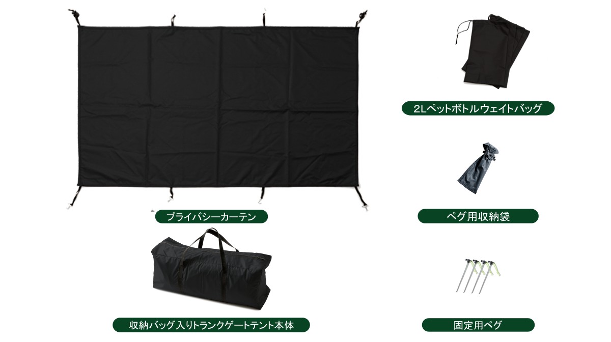 ●付属品:バックゲートリビング/2Lウェイトバッグ(4個)/ペグ4本ペグ/バック1袋/収納バッグ