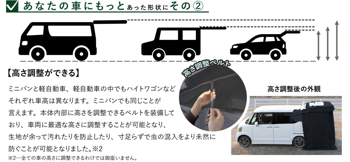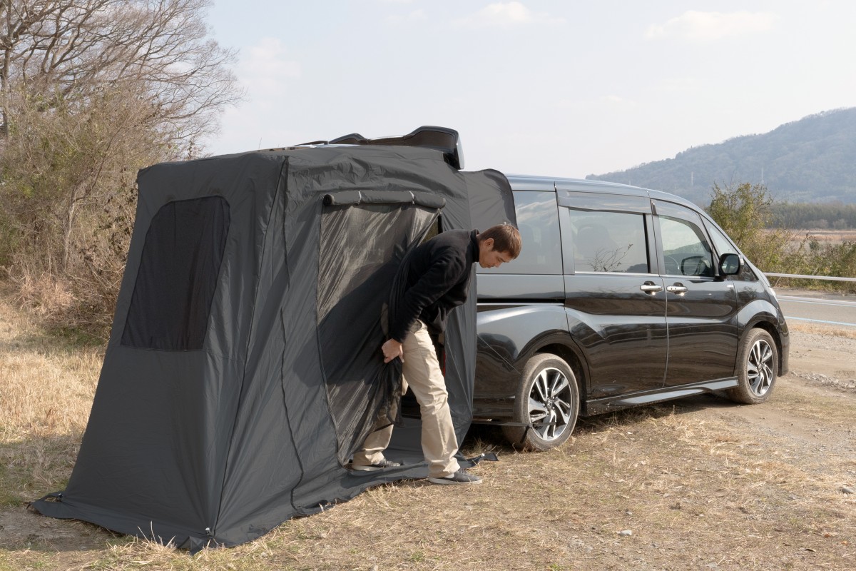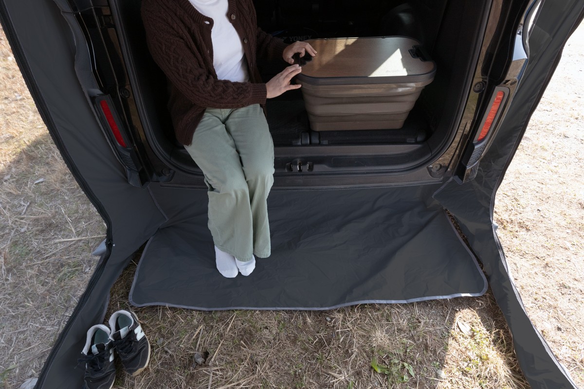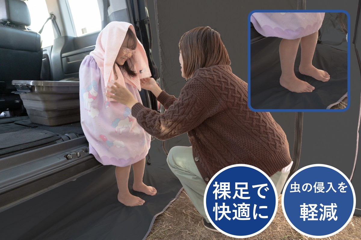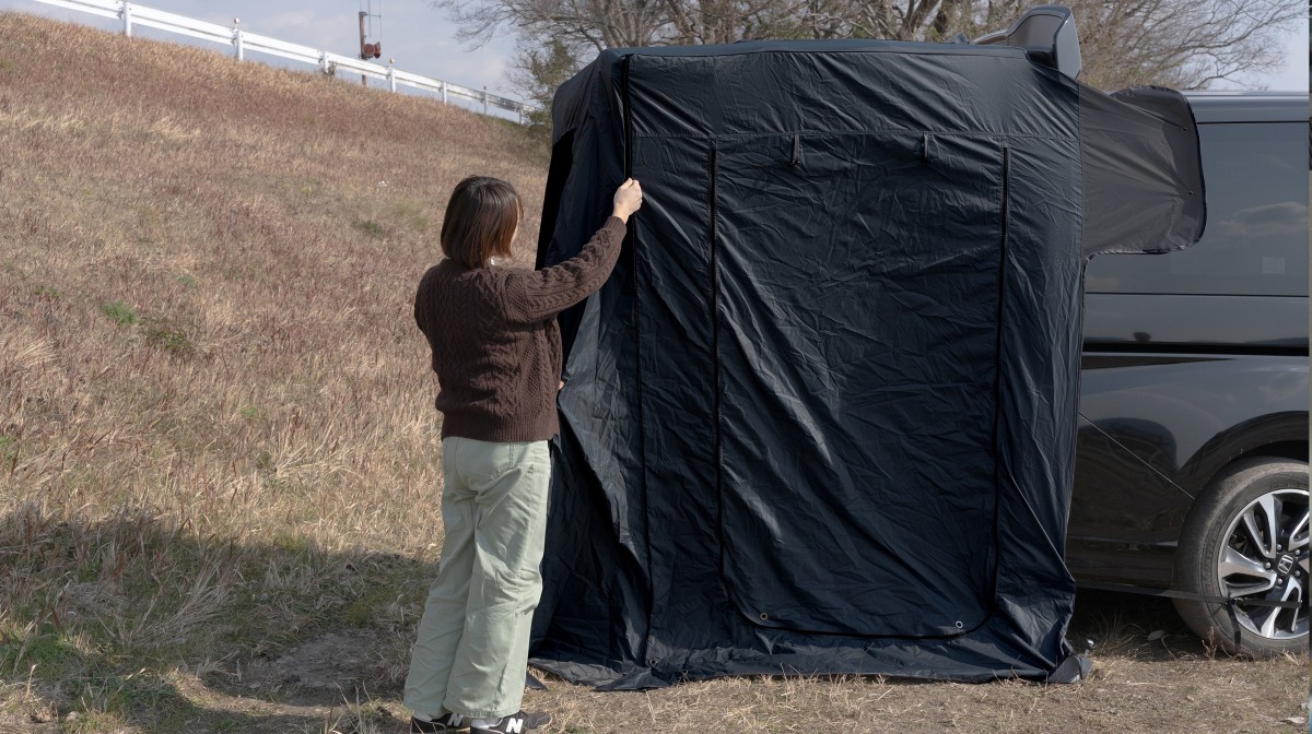 マンションでも車内でも邪魔にならないコンパクト設計。トランクで着替えなどできるから車に砂などの汚れを持ち込ませず、帰ってからもラクラク♪一人でもかんたんに設営・撤収が行えます。メッシュモードにするとテント内に居ながらブラックメッシュの効果により外の景色を楽しめ、遮光モードにするとプライバシー確保がかんたんに行え、災害時にも役立ちます。拡張モードを使用するとさらに広い空間ができ、より快適にお過ごしいただけます。中に雨風が入りにくいテントスカートも装備され、防水・撥水性に優れており、メンテナンスも楽に行えます。
