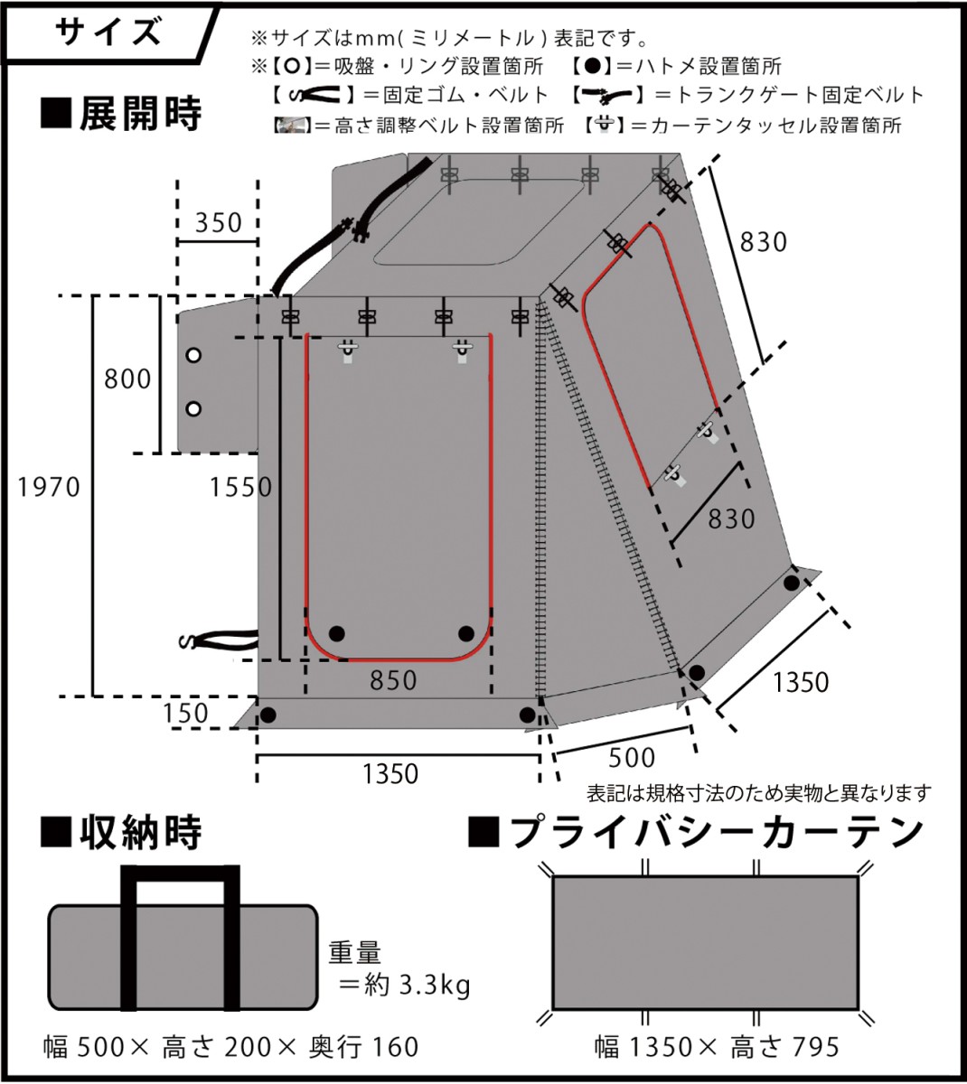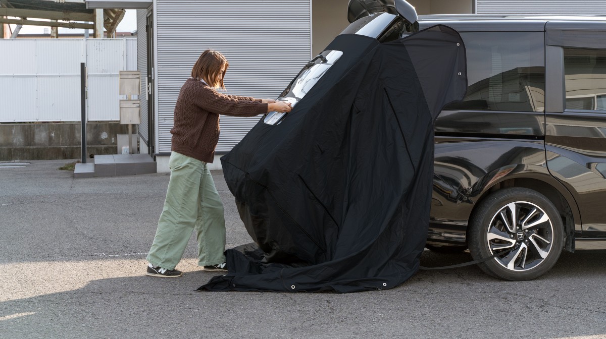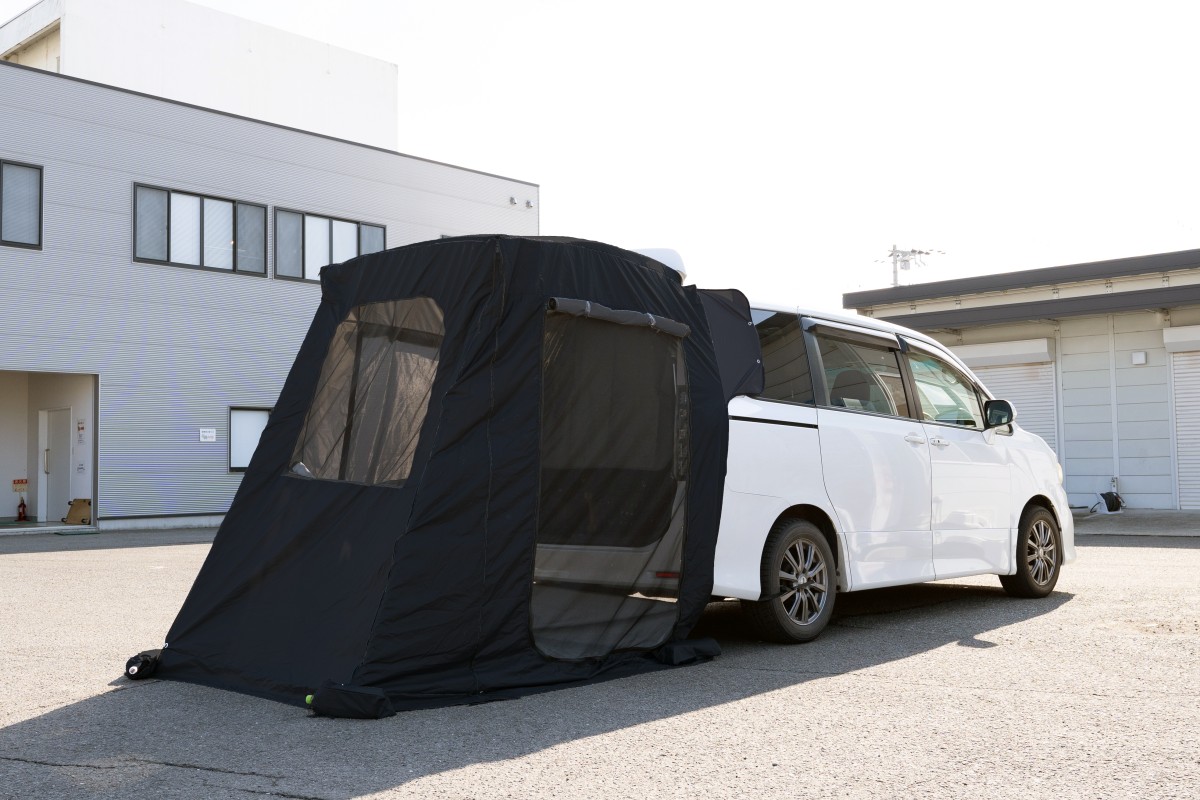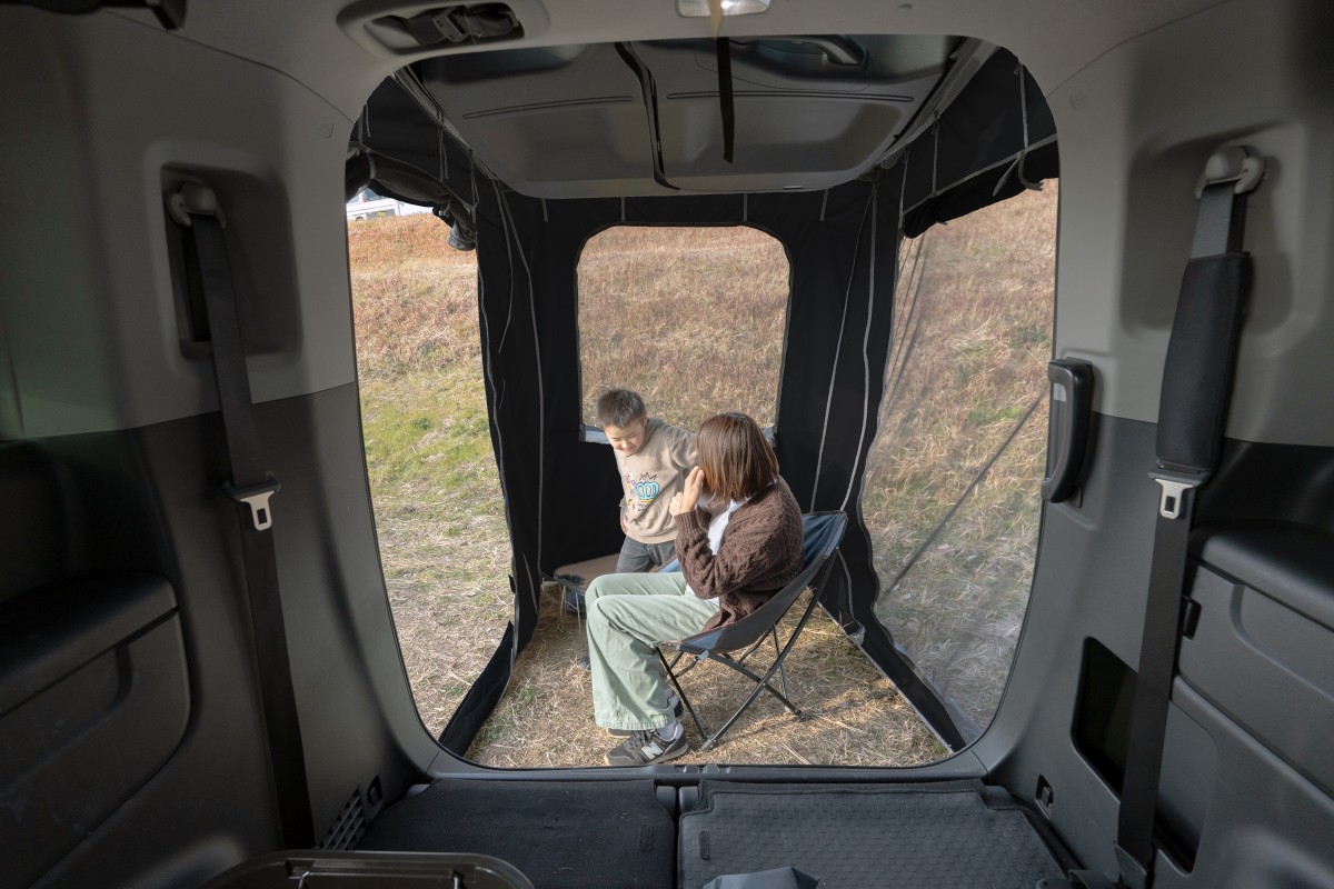 マンションでも車内でも邪魔にならないコンパクト設計。トランクで着替えなどできるから車に砂などの汚れを持ち込ませず、帰ってからもラクラク♪一人でもかんたんに設営・撤収が行えます。メッシュモードにするとテント内に居ながらブラックメッシュの効果により外の景色を楽しめ、遮光モードにするとプライバシー確保がかんたんに行え、災害時にも役立ちます。拡張モードを使用するとさらに広い空間ができ、より快適にお過ごしいただけます。中に雨風が入りにくいテントスカートも装備され、防水・撥水性に優れており、メンテナンスも楽に行えます。